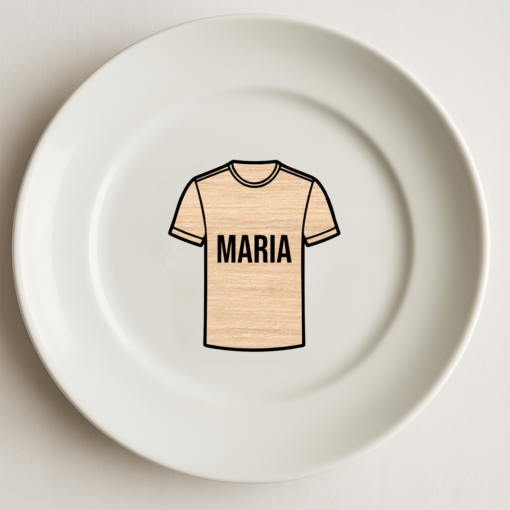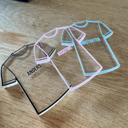Sæt et sporty og personligt præg på borddækningen med vores bordkort formet som en fodboldtrøje. Vælg mellem egetræ, valnød eller gennemsigtig akryl - og få navn trykt i sort, blå eller pink. Perfekt til konfirmation, fødselsdag, klubfest eller temabegivenheder. Størrelse: 7,0 × 7,8 cm.