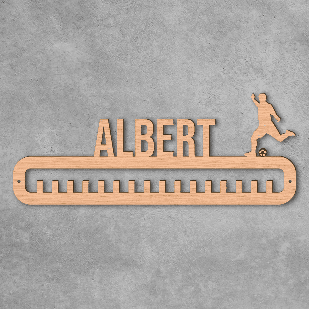 Perfekt til fodboldspillere og sportsentusiaster til at udstille deres medaljer. Vores medaljeholder, tilgængelig i elegant egetræ eller valnød, har et simpelt design, der passer ind i ethvert rum. Inkluderer afstandsstykker for en flottere præsentation.