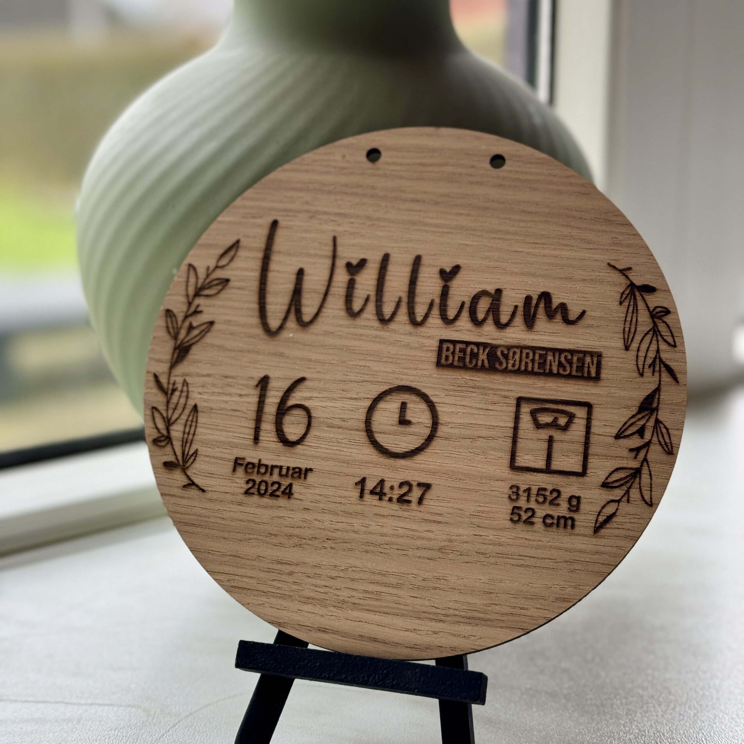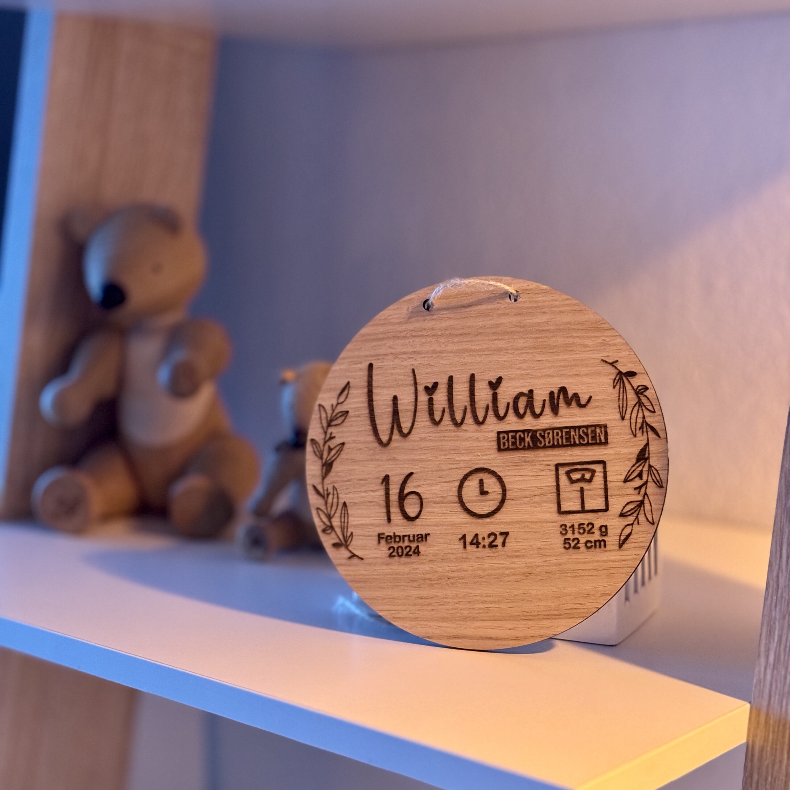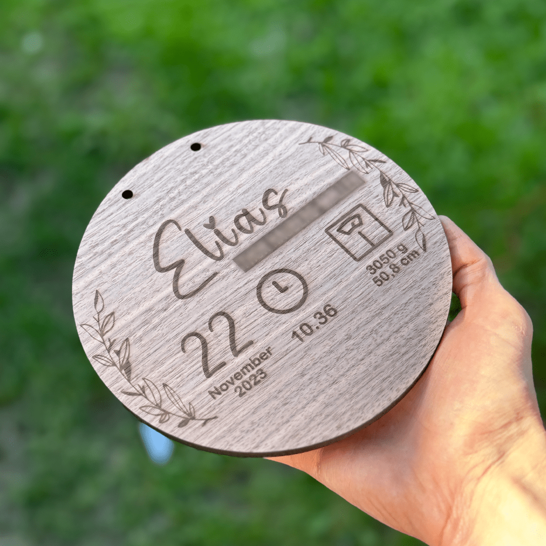 Denne skræddersyede fødselstavle tilbyder en smuk måde at fremvise de første og mest mindeværdige informationer: jeres barns navn, vægt, længde samt fødselsdato og tid. Hver detalje graveres med præcision for at skabe et varigt minde, der kan udstilles stolt i ethvert hjørne af hjemmet.